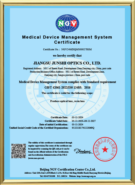 Junshi a lancé des objectifs haute définition 1.60, anti-lumière bleue et résistants aux rayures.